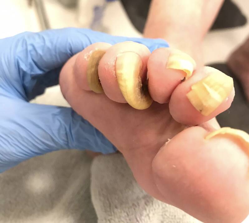 - Een gespecialiseerde voetverzorgster zal deze nagels dunner frezen en knippen + nagelwallen reinigen.